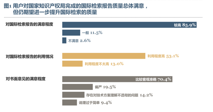 根据世界知识产权组织(WIPO)发布的数据显示,2016年,来自中国申请人的PCT申请共计43168件,同比增长44.7%,在美国、日本之后位居世界第三;2017年,来自中国申请人的PCT申请共计48882件,同比增长13.2%,在美国之后位居世界第二。为全面、持续、动态地掌握中国用户对PCT体系的利用情况和实际需求,2017年国家知识产权局继续开展PCT制度在中国实施状况调查。 一、调查的基本情况 2017年的调查主要采取问卷调查、深度访谈(以下简称“深访”)以及召开座谈会的形式收集用户意见。调查共回收问卷326份,涉及8个省、直辖市,20多个行业,召开了5场用户座谈会,对9家用户的知识产权负责人进行了深度采访。 二、调查的主要发现 (一)用户对国家知识产权局完成的国际检索报告质量总体满意,但仍期望进一步提升国际检索的质量 问卷统计显示,85.9%的用户认为国家知识产权局完成的国际检索报告质量较高(2016年为85.7%,2015年为60.9%),11.5%的用户表示一般,只有2.6%的用户对此表示不满意。70.4%的用户认为国家知识产权局完成的书面意见比较客观准确,但也有19.5%的用户认为国家知识产权局做出的书面意见偏严,14.2%的用户认为存在对技术方案理解不透彻的问题,9.4%的用户认为说理过于简单。对于进入国家阶段后国家知识产权局完成的国际检索报告的利用情况,53.1%的用户认为利用程度高,13.0%的用户认为利用程度不太高,主要原因是各国法律制度存在差别及对比文件的语言障碍。