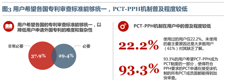 PCT申请进入国家阶段后,多数用户希望各国的专利审查标准能够统一,以降低用户申请外国专利的难度和复杂性。其中37.9%的用户认为非常必要,29.4%的用户认为必要。 问卷调查显示,PCT-PPH机制在用户中的普及程度较低,使用过的用户仅22.2%。未使用的原因有多种,但最主要的原因还是大多数用户(61%)对其缺乏了解。在利用座谈会和深访的机会为用户普及PCT-PPH机制相关知识后,93.3%的用户表示希望PCT-PPH成为PCT制度的一部分,使得符合PPH要求的PCT申请在接受该机制的所有PCT成员国都能得到加快审查。深访也显示,大部分用户表示在未来的PCT申请中会尝试使用PCT-PPH机制加快审查。