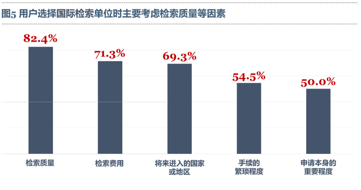 (四)PCT申请的代理率较高,但专利代理机构的服务水平有待提高 深访和座谈显示,绝大多数用户都将PCT申请交由专利代理机构办理,但专利代理机构的水平参差不齐,用户选择高水平专利代理机构存在困难,很多情况下专利代理机构仅起到传送文件的作用,对通知书的答复、进入国家阶段的时机等无法给出有价值的建议,不能满足其需求。也有专利代理机构表示,其自身业务能力不够、水平不足,对PCT申请的流程管理和不同国家法律制度等内容缺乏深入了解,希望有机会与PCT申请服务水平高的专利代理机构和PCT制度运用熟练的企业开展学习交流活动。 (五)用户选择国际检索单位时主要考虑检索质量等因素 问卷统计显示,如果允许用户自行选择国际检索单位,用户选择时重点考虑因素主要有检索质量(占比82.4%)、检索费用(占比71.3%)、将来进入的国家或地区(占比69.3%)、手续的繁琐程度(占比54.5%)以及申请本身的重要程度(占比50.0%)。
