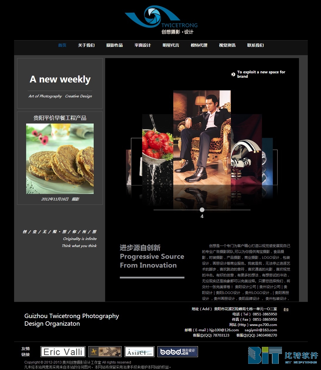 案例名称:贵州创想摄影设计工作室 主办单位:贵州创想摄影设计工作室 案例地址:# 平面设计:贵州比特软件有限公司 所属行业:摄影设计 上线时间:2012/10/03 案例简介:创想是一个专门为客户精心打造以视觉感受展现自己的专业广告摄影团队,可以为你提供淘宝摄影,食品摄影,时装摄影,产品摄影,商业摄影,LOGO设计,包装设计,画册设计等商业服务。 案例赏析