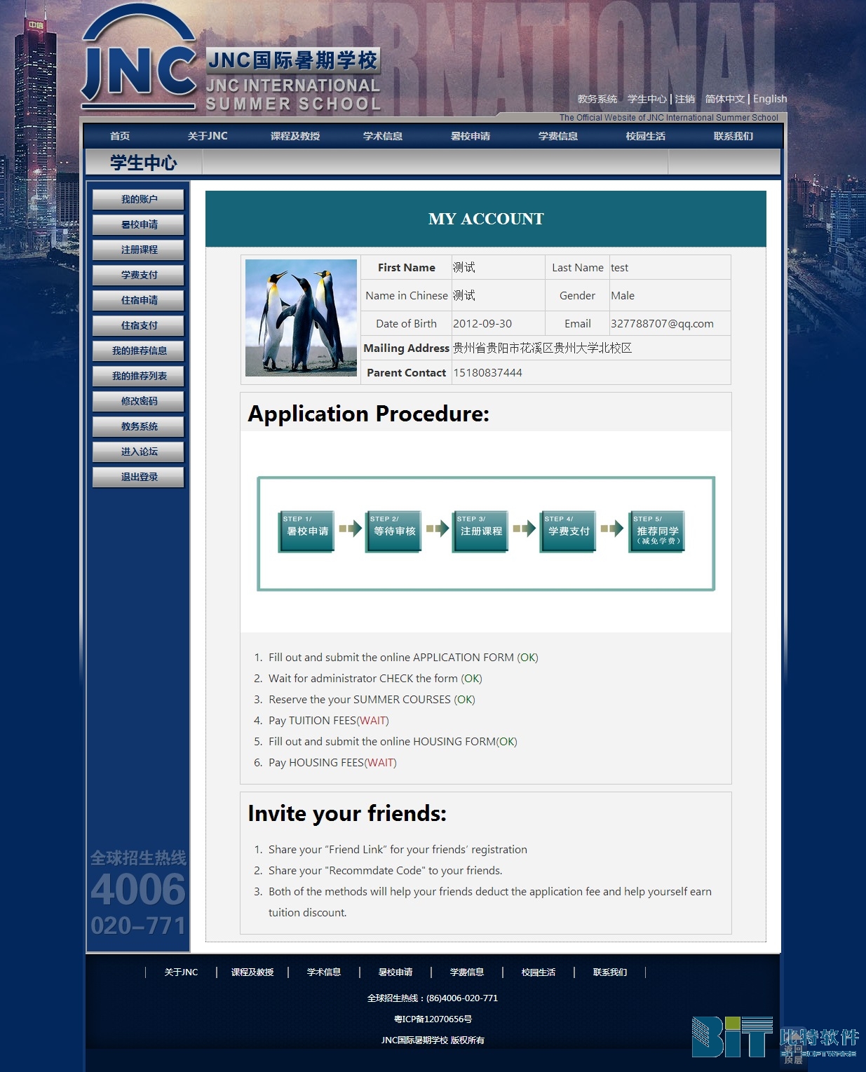 本网站具有宣传、展示、学生在线注册、选课、在线支付学费、教务系统、论坛等功能,为双语(中、英文)网站。